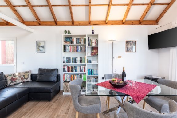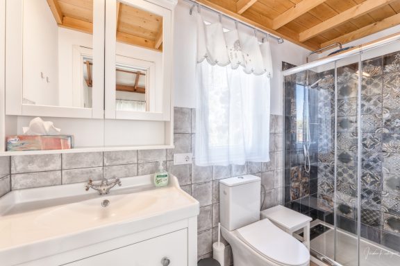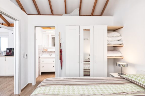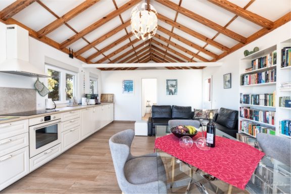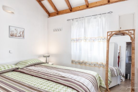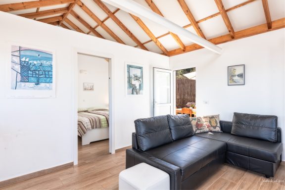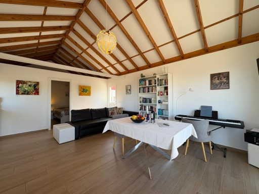 Im Haus gibt es ein großes helles Wohnzimmer mit hoher Holzdecke und moderner Küchenzeile , Essbereich, gemütlicher Sofaecke, kleiner Bibliothek, Schallplatten und Plattenspieler, ein Schlafzimmer mit Doppelbett (1.60 x 2.00), Schrank und großem Spiegel und ein Bad mit Fenster und großer moderner Dusche. Im Anbau finden Sie ein zweites Schlafzimmer mit großem Bett (1.40 x 200) und angrenzendem Bad mit Fenster, WC und Waschtisch. Beide Schlafzimmer und Bäder sind mit Fussbodenheizung ausgestattet, die Schlafzimmer außerdem mit Klimaanlage. Der Energiebedarf des Hauses wird tagsüber durch eine Photovoltaikanlage unterstützt.